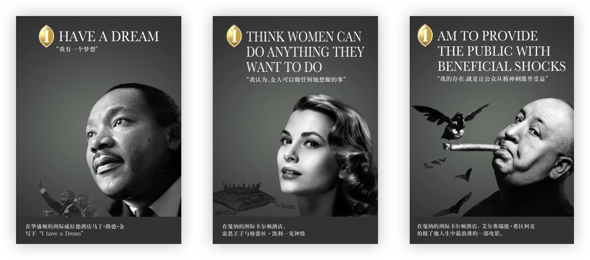 洲际酒店在品牌推广中使用了4位名人肖像:马丁路德金、希区柯克、格蕾丝凯莉以及贝蒂戴维斯。借助他们在各洲际酒店住宿的历程,形象的描绘出洲际酒店的悠久历史和奢华,是高端人群外出住宿的首选。